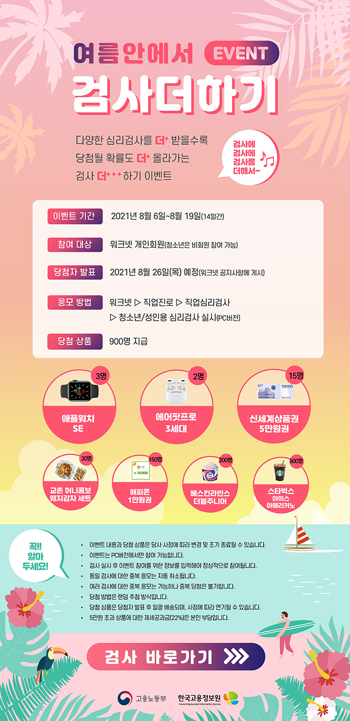 4) 참여방법: 워크넷 > 직업진로 > 성인용 직업심리검사 실시(PC버전) > 실시 완료 후 이벤트 응모