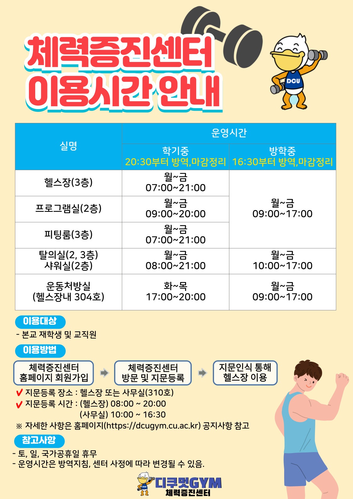 2025-1학기 체력증진센터 헬스장 및 프로그램실을 아래와 같이 운영 하오니 많은 이용 바랍니다.