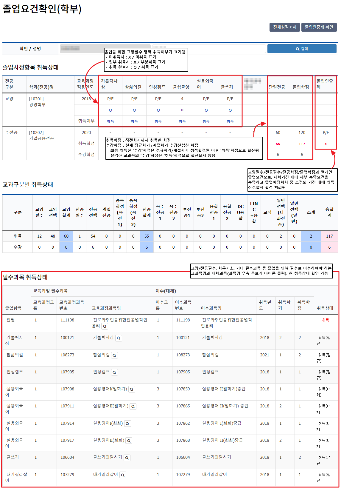 「진로취업」교과목 필수 이수 대상자인 학생은, 해당 교과목을 이수하고 졸업요건을 충족할 수 있도록 참고하시기 바랍니다.