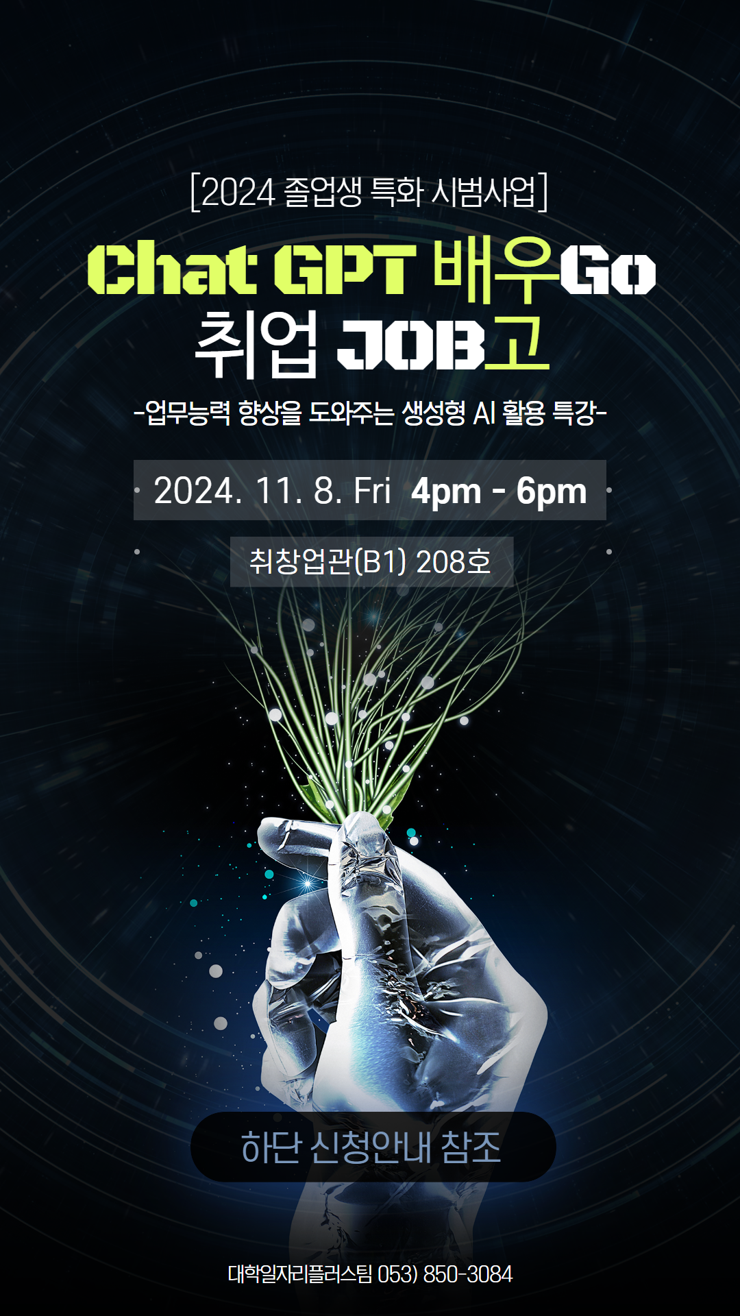 졸업생 특화 (시범)사업의 일환으로 실시하는 (미)취업 졸업생 대상 생성형 AI를 활용한 업무능력 향상 특강 「Chat GPT 배우GO 취업 JOB고」 프로그램을 아래와 같이 시행하오니 각 학과(전공)별 졸업생의 많은 신청 바랍니다.