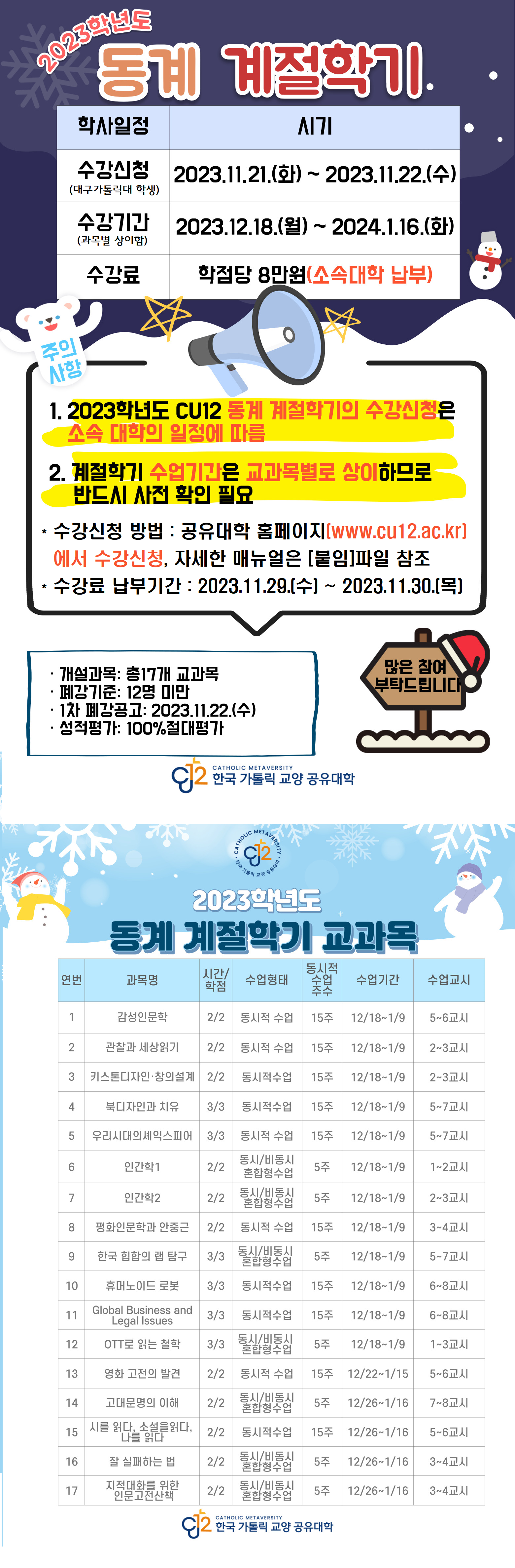 2. 한국 가톨릭계 대학교에서 설립한 '한국 가톨릭 교양 공유대학(CU12)'에서는 공유 플랫폼을 통하여 2023학년도 동계 계절학기를 시행할 예정입니다. 이에 각 학과(전공)에서는 아래의 내용을 참고하시어 수강신청 일정, 개설 교과목 등을 소속 학생들에게 안내하여 주시기 바랍니다.