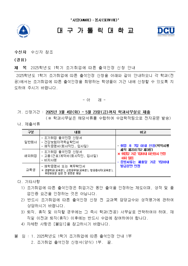 붙 임 : 1. 2025학년도 1학기 조기취업에 따른 출석인정 안내 1부