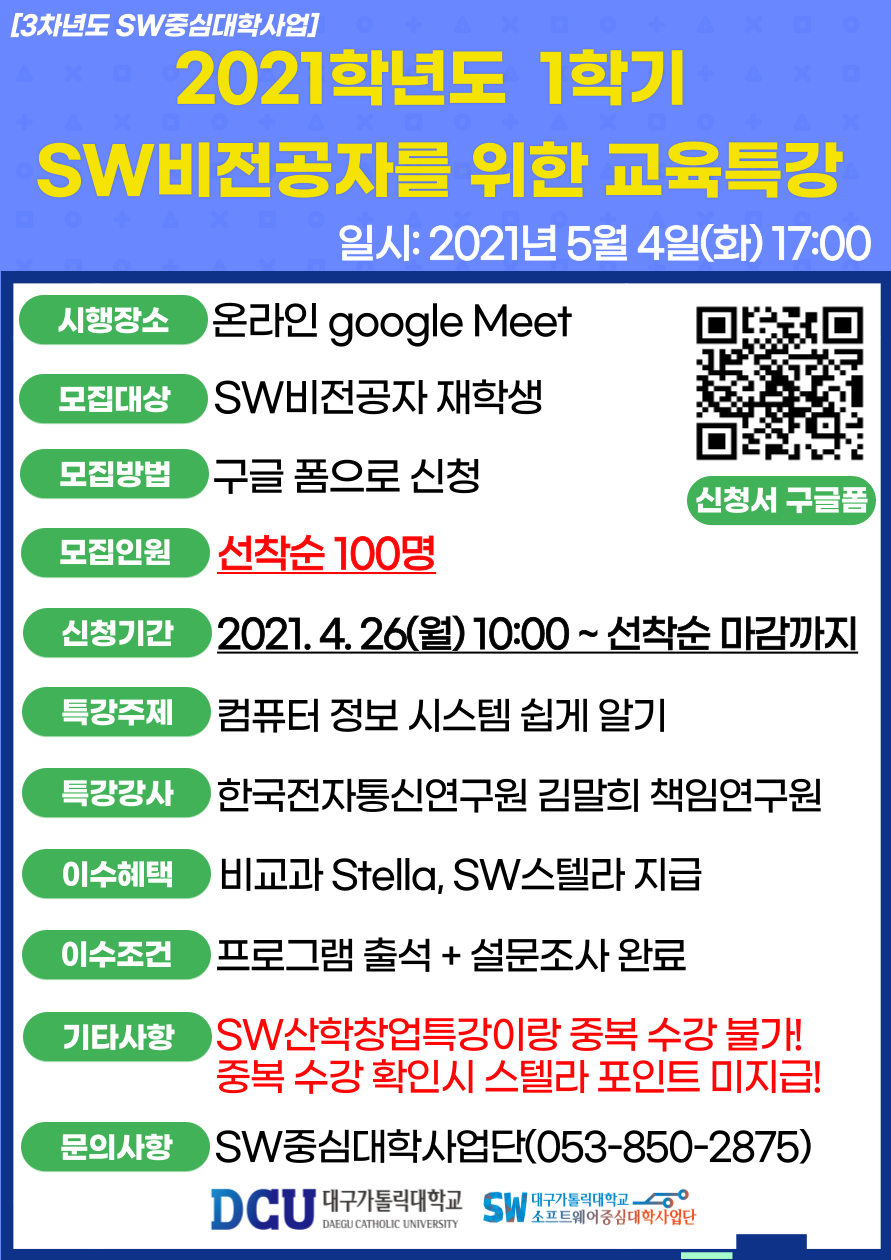 SW중심대학사업의 일환으로 SW비전공자 재학생의 SW분야 진로탐색을 위한 특강 프로그램을 아래와 같이 진행하고자 하오니 학생들의 많은 참여를 부탁드립니다.