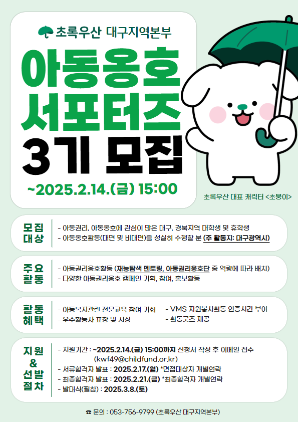 - 아동복지대표기관 초록우산 대구지역본부에서 아동옹호서포터즈 3기를 모집합니다!