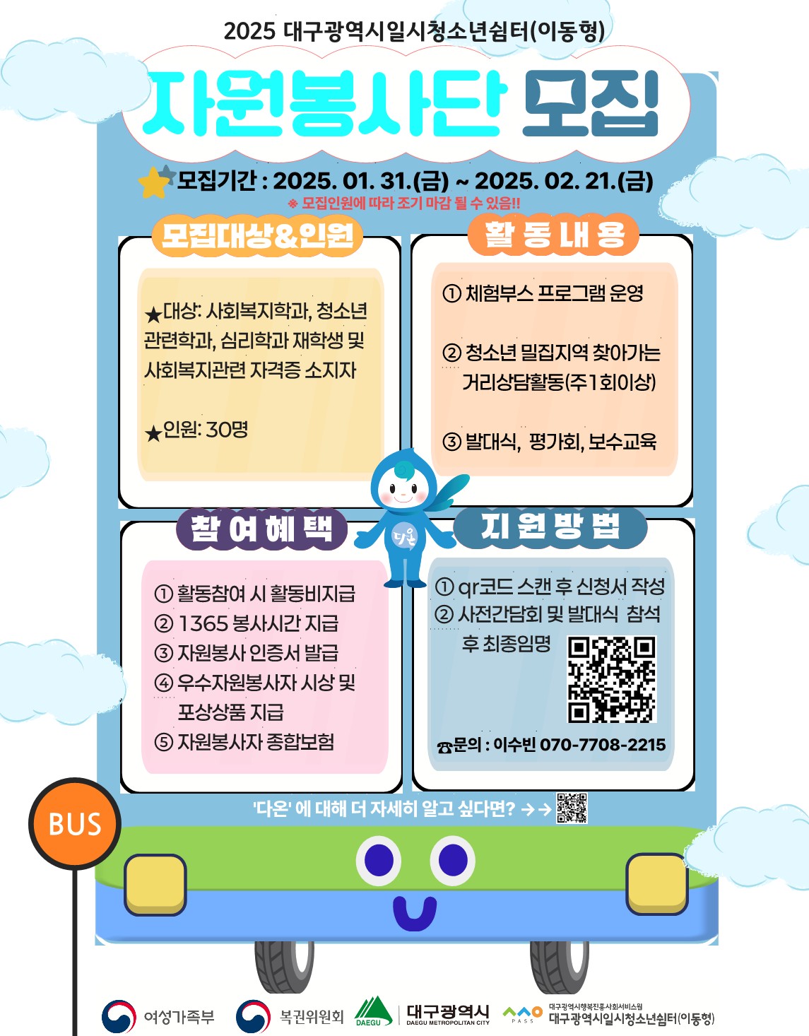 대구광역시행복진흥사회서비스원이 운영하는 위기 및 가정 밖 청소년을 위한 움직이는 청소년쉼터입니다.