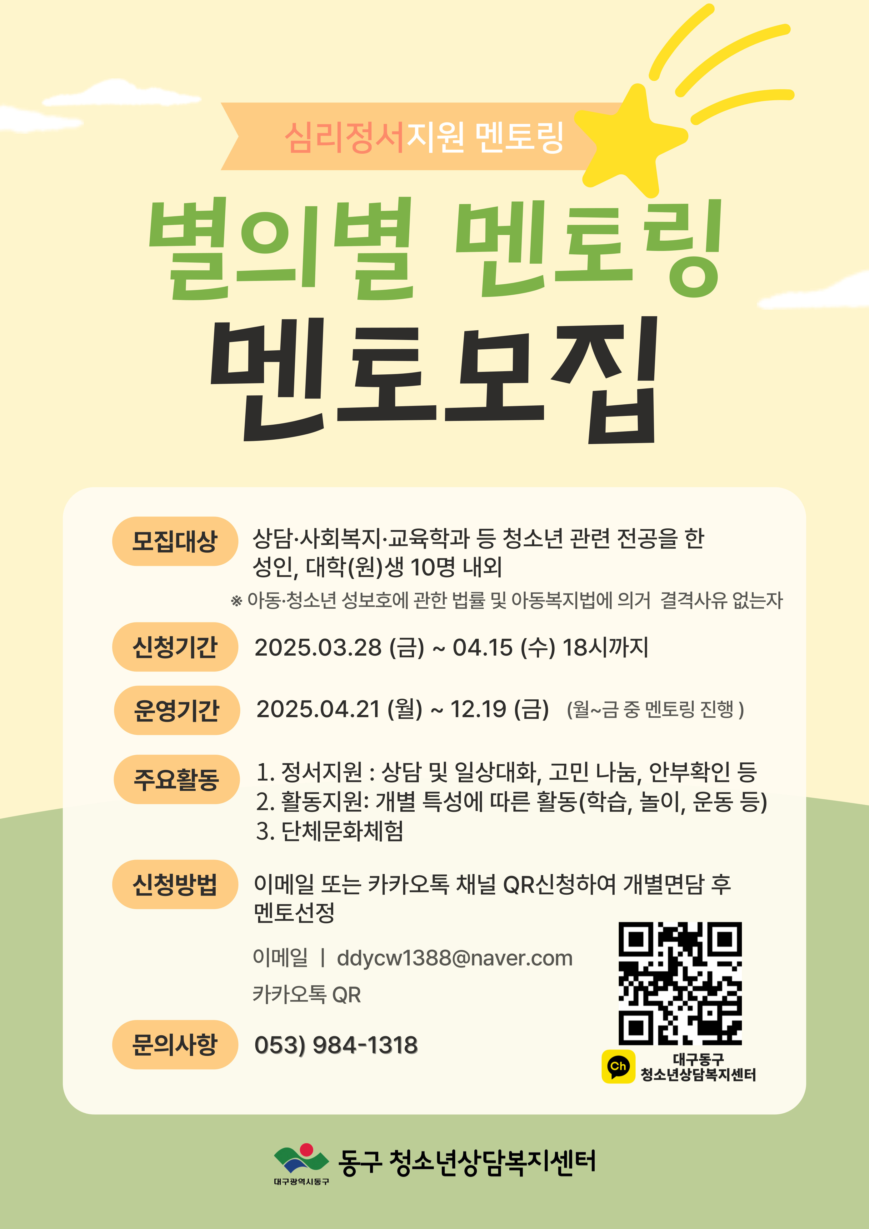 2025년 대구광역시 동구 청소년상담복지센터 정서지원 멘토링 별의별 멘토링 멘토 모집 안내