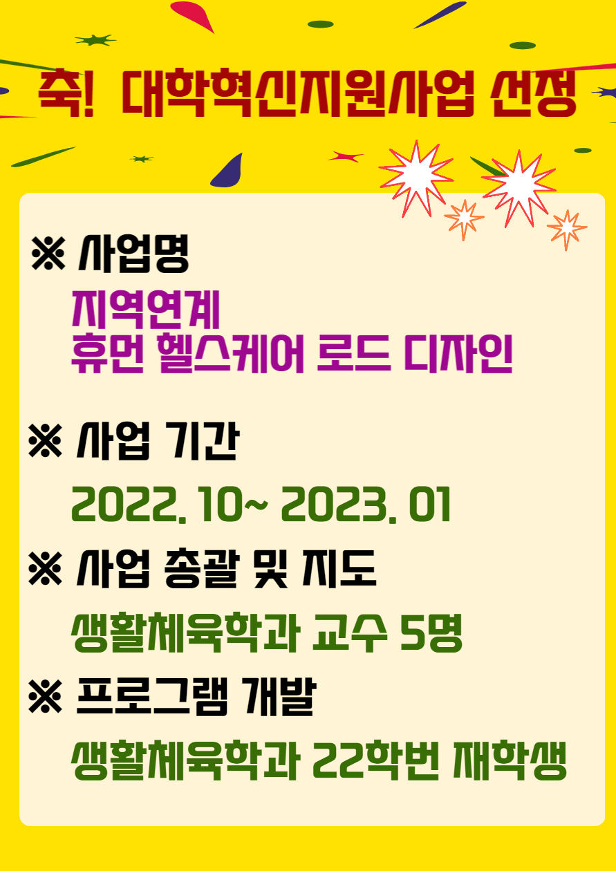 2022 대학혁신지원사업에 생활체육학과< 지역연계 휴먼헬스케어 로드 디자인>이 선정되었습니다. ^^ 짝!짝!