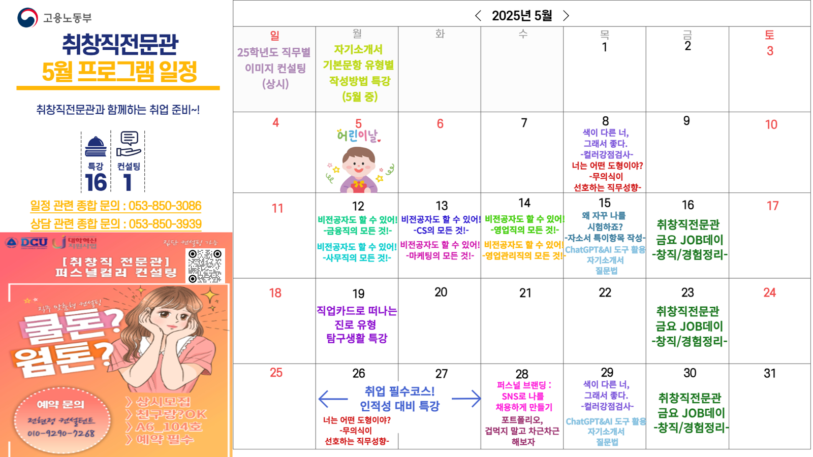 5월 16일, 23일, 30일 (※매주 금요일) | 13:00~15:00 | 취창직전문관 금요 JOB데이 (창직&경험정리 편) [Part 1. 미래를 여는 창직의 세계: 나만의 직업을 디자인하다] | B1_401호 |