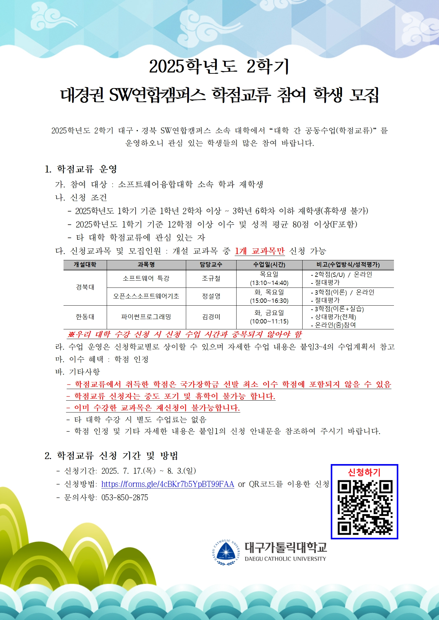 대경권 SW연합캠퍼스' 프로그램의 일환으로 2025학년도 2학기 학점교류 프로그램 신청 안내를 진행하고자 하오니 많은 관심과 참여를 바랍니다.